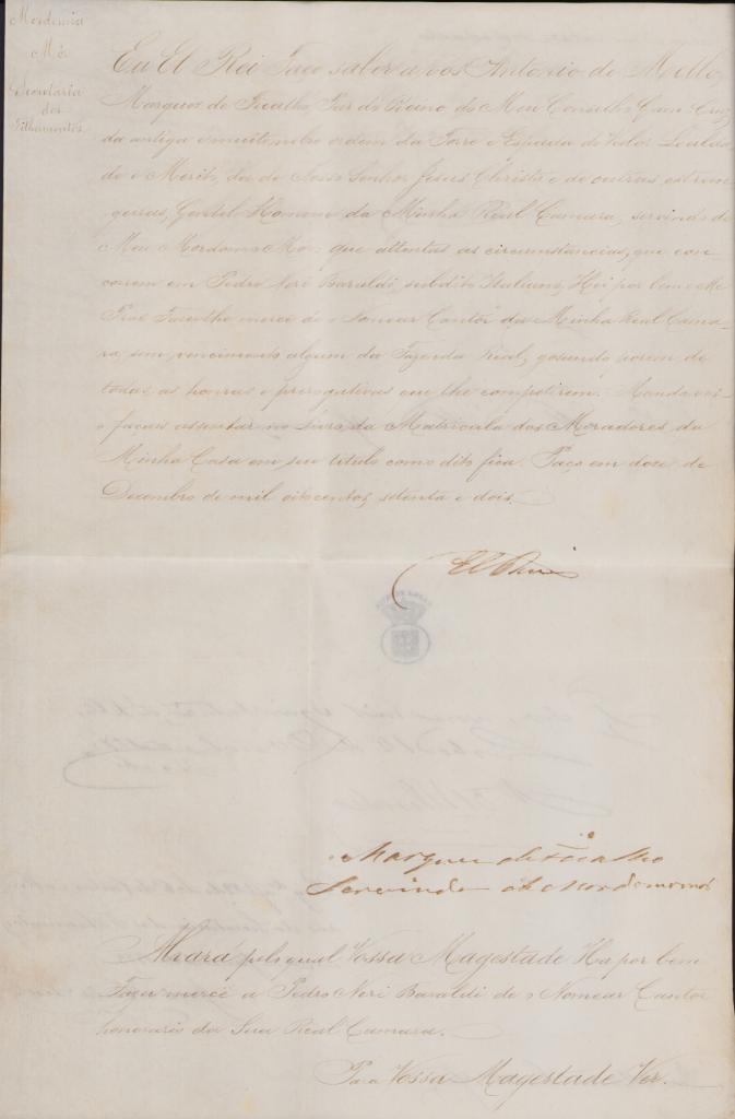 Nomina del tenore Pietro Neri Baraldi a Cantore della Camera Reale di sua Maestà il Re del Portogallo e dell'Algarve.