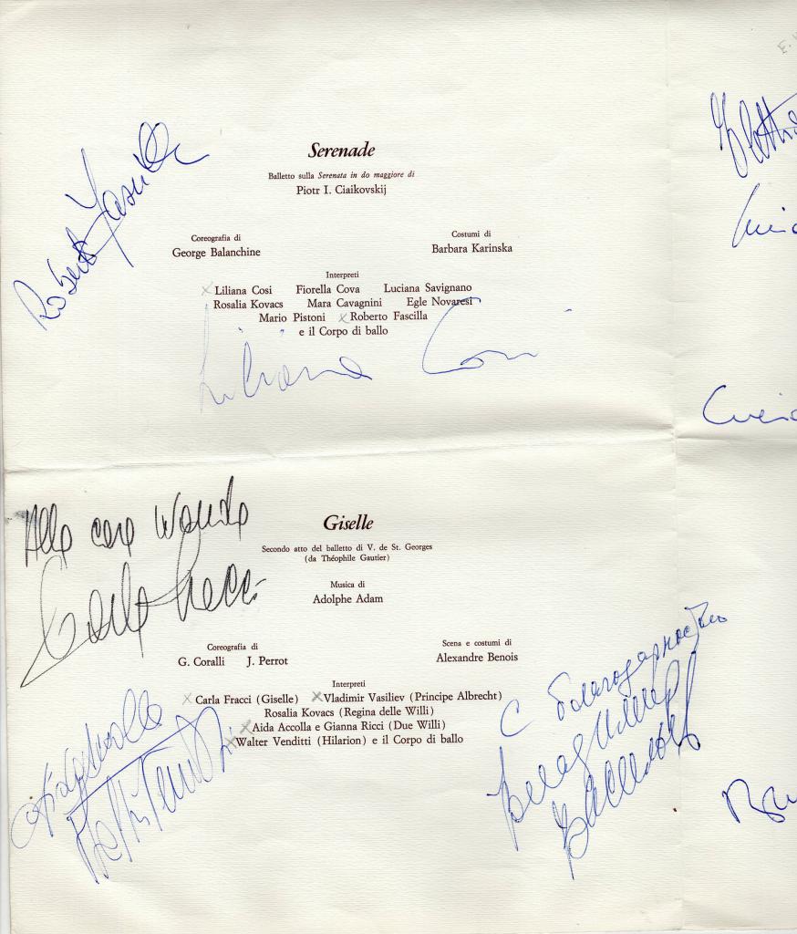 La locandina ufficiale presenta gli autografi autenticati di diversi personaggi quali: Liliana Corsi, Roberto Fascilla, Carla Fracci - che per l'occasione interpreta Giselle-, Vladimir Vasiliev, Aida Accolla, Walter Venditti, Elettra Morini, Luciana Novaro, Emanuele Luzzati, Luciana Savignano, Bruno Telloli.