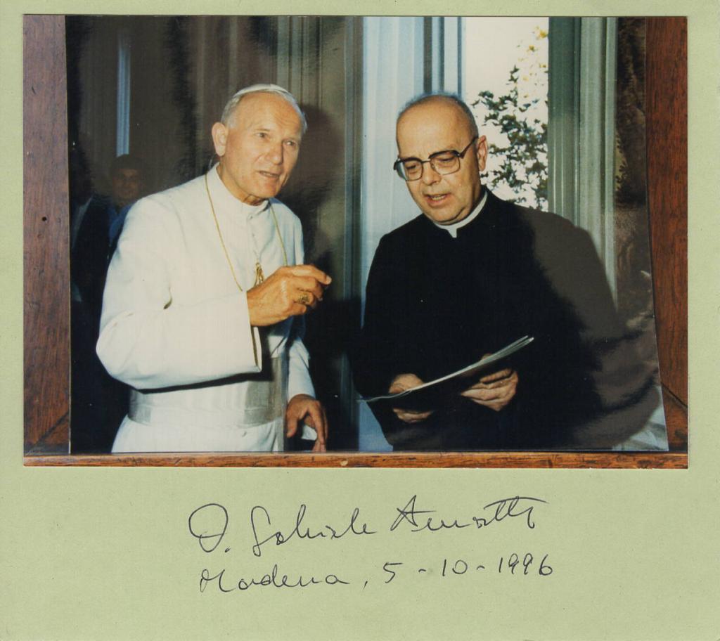 Fotografia con Papa Giovanni Paolo II autografata da Amorth a Roma in data 5 Ottobre 1996.