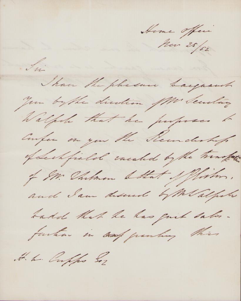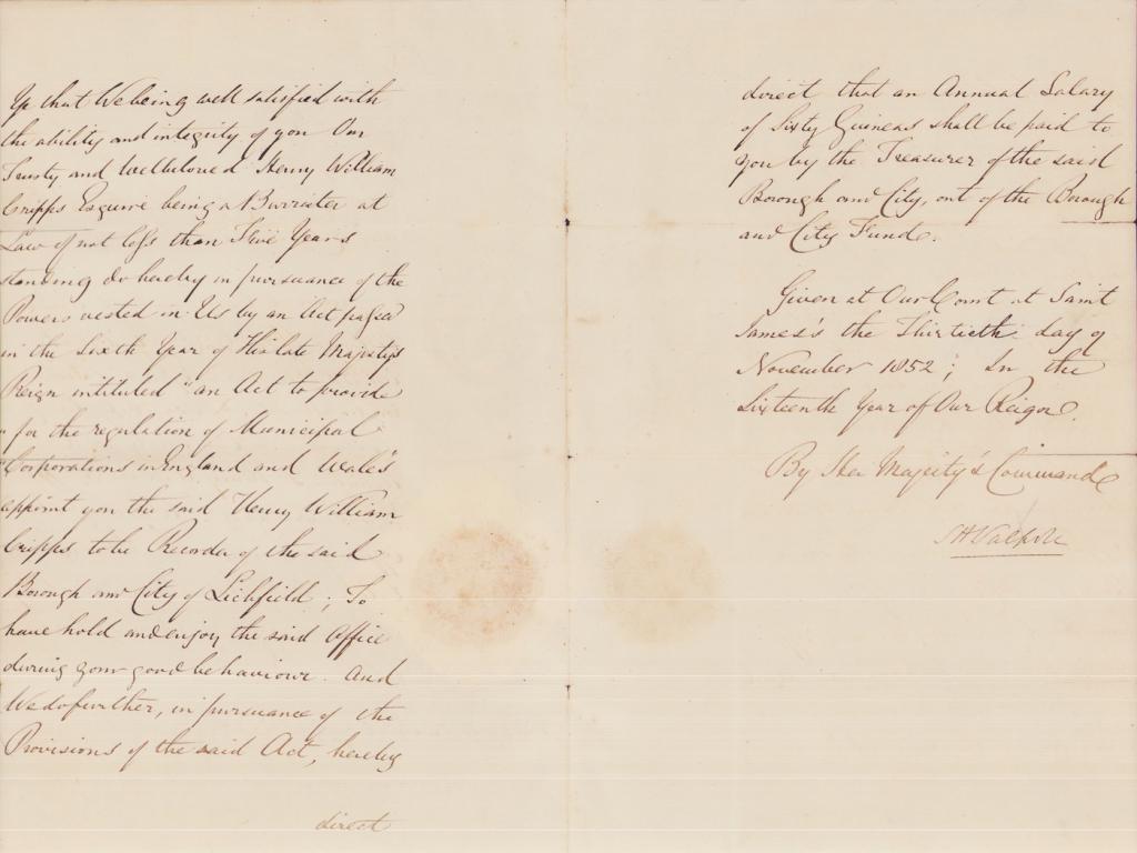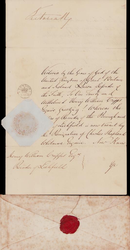 Carteggio per nomina a Giudice Onorario per l'avvocato Henry William Cripps, incaricato dalla Regina di ricoprire il posto del dimissionario Charles Esquire per la città di Lichfield.