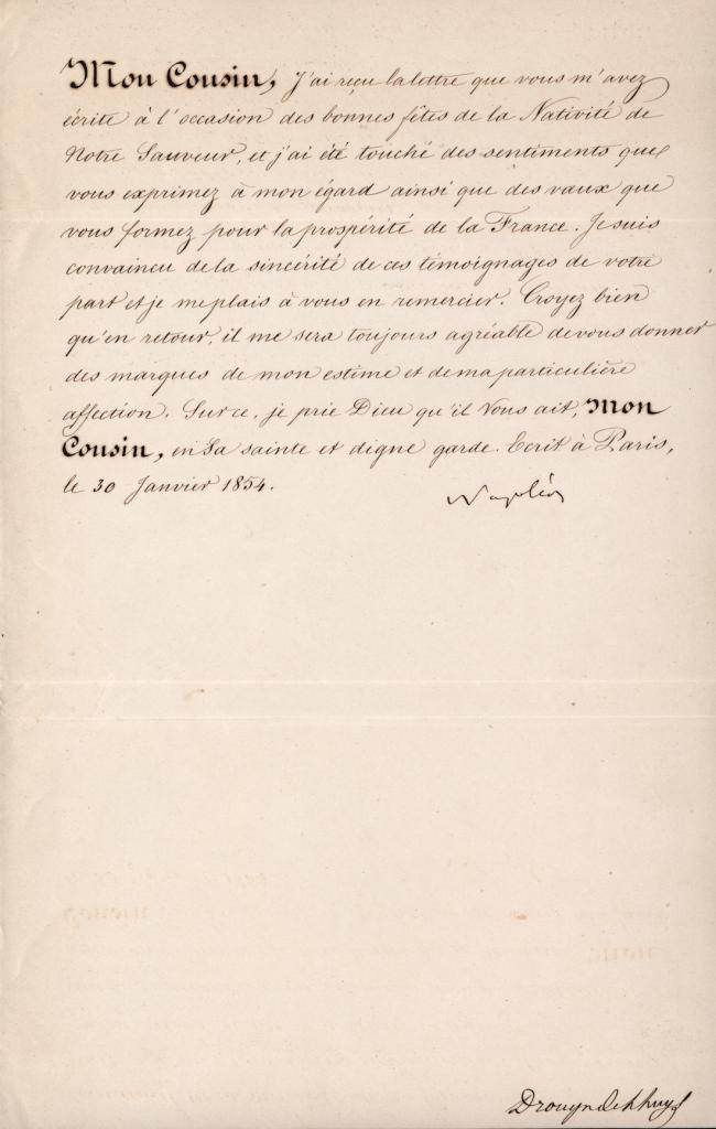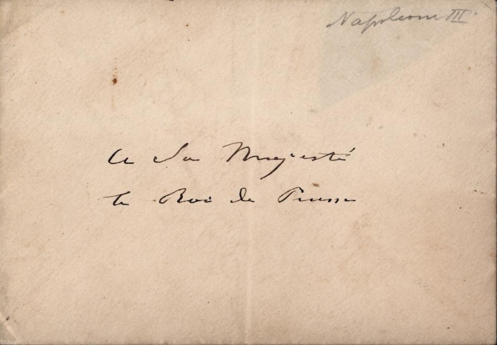 Lettera manoscritta con firma autografa di Napoleone III di Francia nella quale ringrazia il re di Prussia, suo cugino, per gli auguri di Natale ricevuti e in cui ribadisce la sua particolare affezione nei confronti suoi e della famiglia. Alla lettera si allega busta manoscritta autografa di Napoleone III con intestazione del destinatario.
