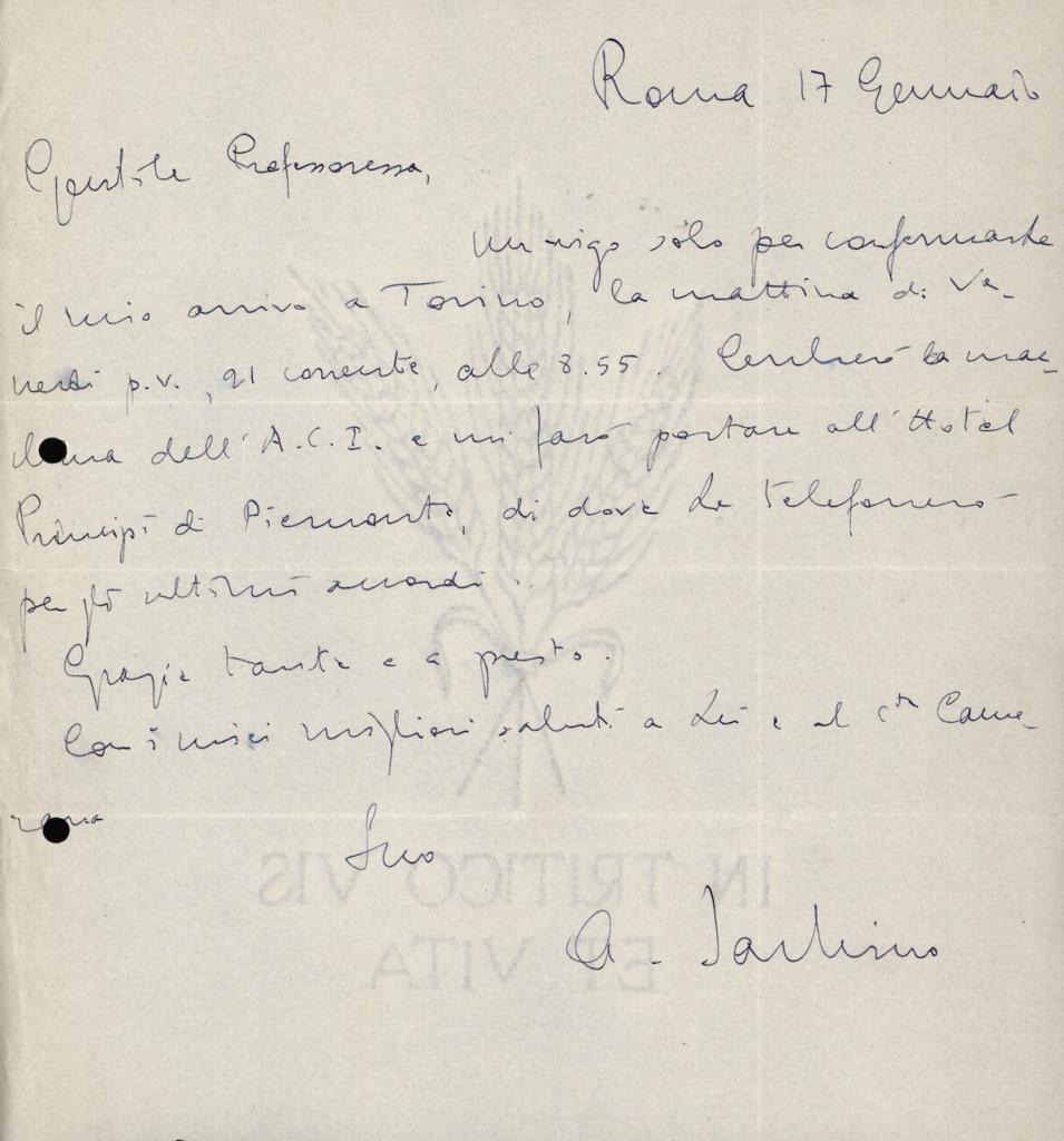 Lettera manoscritta con firma autografa di Angelo Iachino inviata presumibilmente a Irma Antonetto, fondatrice dell'Associazione culturale italiana-ACI, nella quale conferma il suo arrivo a Torino per la mattina del 21. Giunto all'Hotel Principe di Piemonte le telefonerà per gli ultimi dettagli, infine ringrazia e saluta.