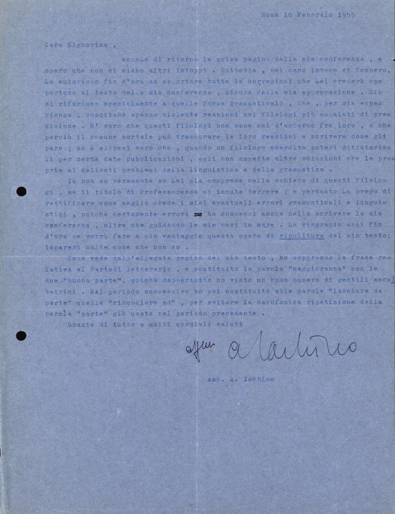 Lettera dattiloscritta con firma autografa di Angelo Iachino inviata presumibilmente a Irma Antonetto, fondatrice dell'Associazione culturale italiana-ACI, nella quale le chiede di poter eseguire un'operazione di ripulitura del suo testo relativo alla conferenza ACI. Infatti, utilizzando solitamente forme grammaticali che suscitano forme violente di disapprovazione nei filologi, vorrebbe evitare possibili critiche da parte loro. Dà conto di alcune modifiche che ha già apportato, poi ringrazia e saluta.