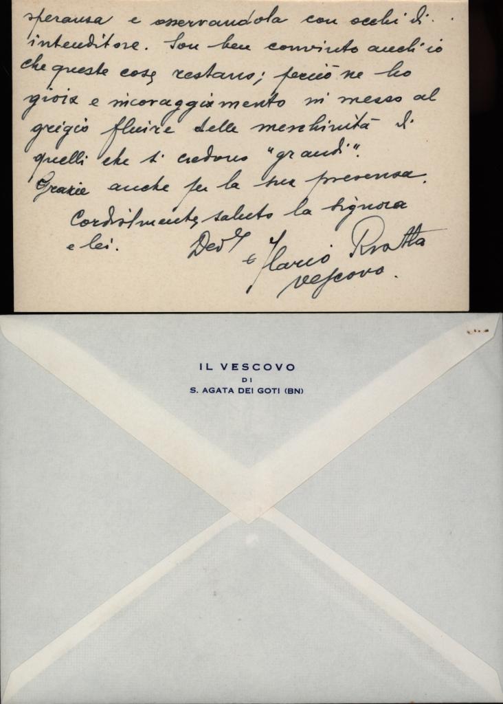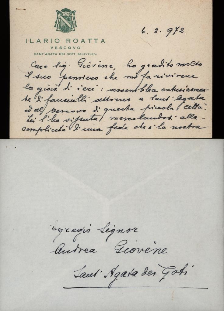 All'interno del biglietto il Roatta ringrazia Andrea Giovene per il pensiero rivolto e poi parla positivamente e con entusiasmo della città di Sant'Agata dei Goti.