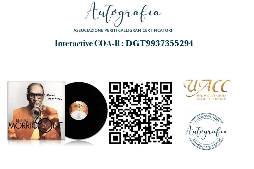 Autografo di Ennio Morricone, celebre compositore e direttore d'orchestra vincitore di due premi Oscar e 5 Golden Globe, apposto su l'album "60 Years of Music" in una speciale tiratura limitata di 2500 copie (n° 269) e di cui solo 500 firmate.