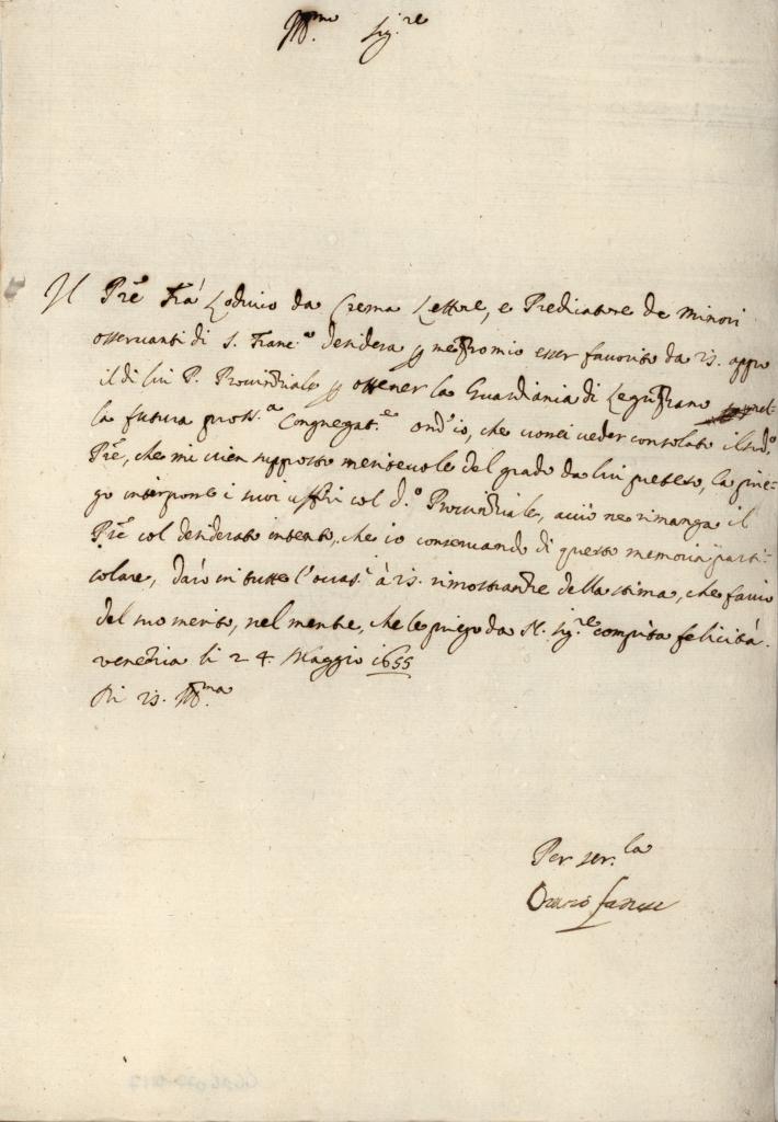 La lettera è redatta a Venezia il 24 Maggio del 1655 e richiede l'intercessione a favore del prelato Ludovico da Crema, lettore e predicatore dei minori osservanti di San Francesco, che vorrebbe ricoprire un incarico per il quale egli pensa che sarebbe qualificato.