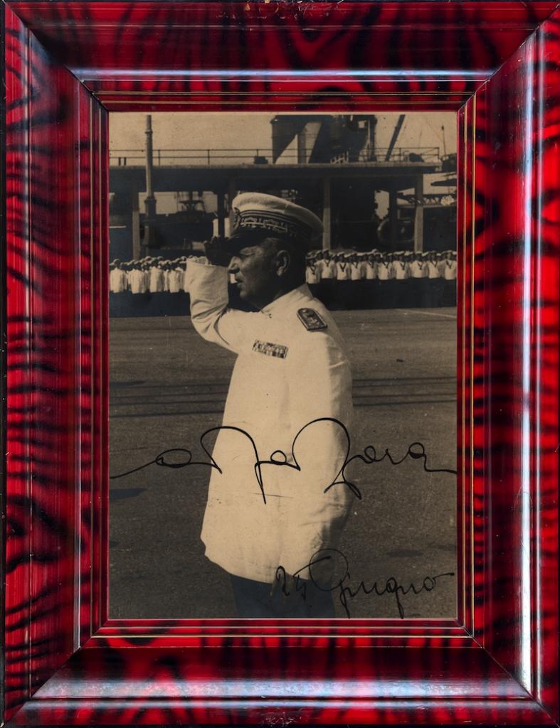 La foto ritrae l'Ammiraglio in divisa, mentre esegue un saluto militare durante una parata. La firma è datata 24 Giugno, non è specificato l'anno.