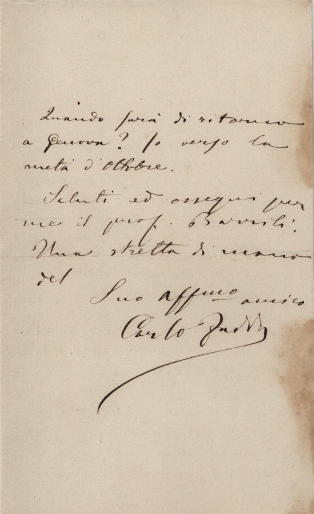 Il Gatti termina la lettera chiedendo al Breschi quando sarà di ritorno a Genova e saluta il Prof. Barrili.