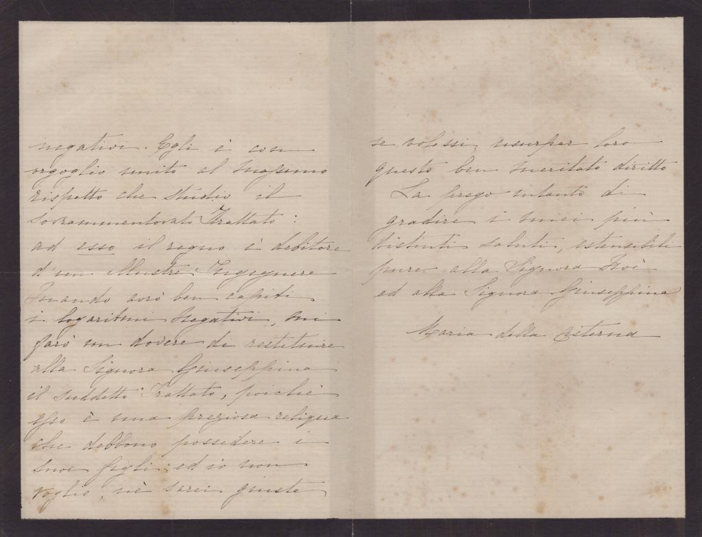 Il contenuto è curioso ed insolito: Maria Vittoria, con uno stile gentile ed educato, ringrazia per l’invio di un volume che tratta di logaritmi, dichiarando apertamente la sua meraviglia per l’argomento e lodando la bontà e l’attenzione del mittente. Colpisce in particolare il passaggio in cui, con umorismo raffinato e spirito vivace, scrive che sarà lieta di restituire il libro “non appena avrò compresi i logaritmi negativi”.