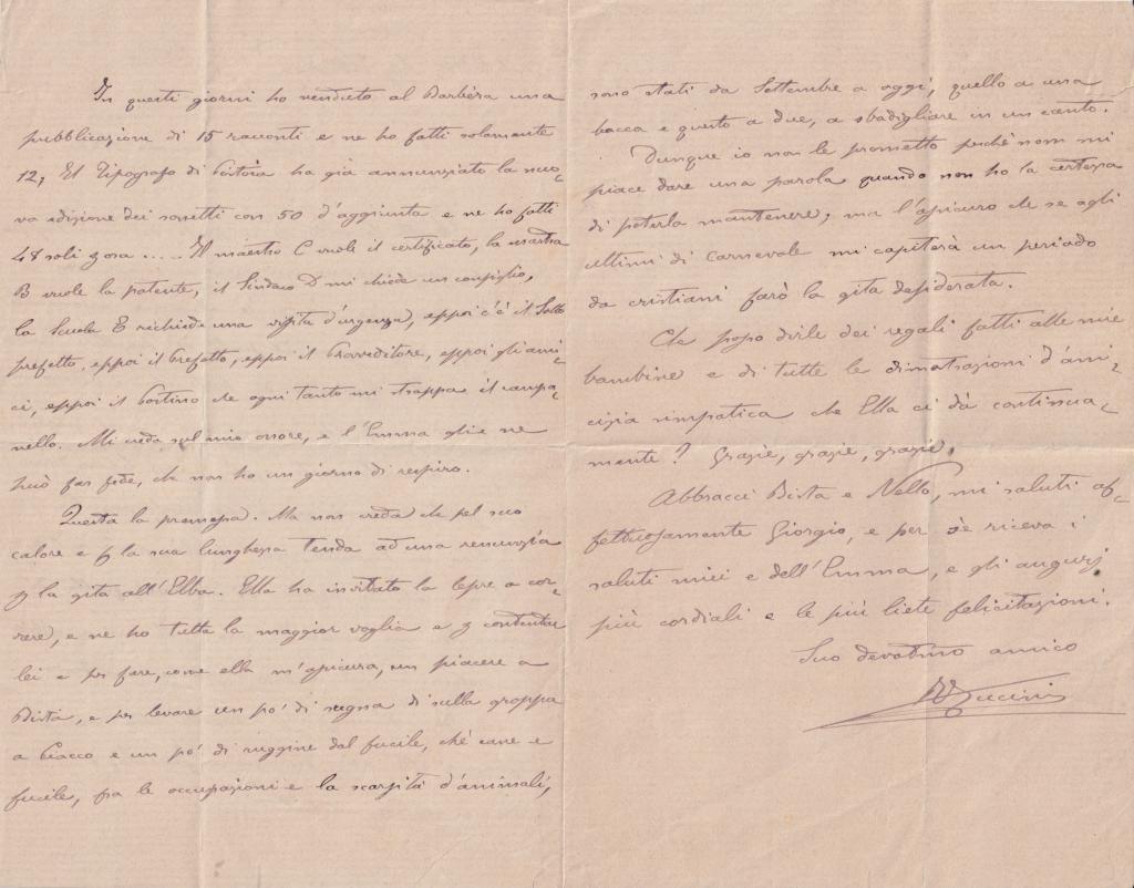 Nel testo, scritto in tono amichevole e confidenziale, l’autore racconta la sua intensa attività lavorativa e i molti impegni che lo tengono occupato quotidianamente. Fucini riferisce inoltre della recente pubblicazione di 18 racconti venduti all’editore Barbera, uno dei principali editori italiani del tempo, e menziona il desiderio di dedicarsi con maggiore calma alla propria produzione letteraria. La missiva si chiude con note di vicinanza affettuosa e con l’annuncio che raggiungerà la destinataria all’Isola d’Elba, luogo a lui caro.