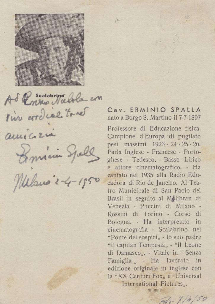 Cartolina d’epoca con dedica interamente autografa e firmata di Erminio Spalla, celebre pugile e attore italiano. La dedica, vergata a penna blu, recita: “Ad Enzo Nubola con viva cordiale e tenera amicizia – Erminio Spalla – Milano 2-4-1950”.