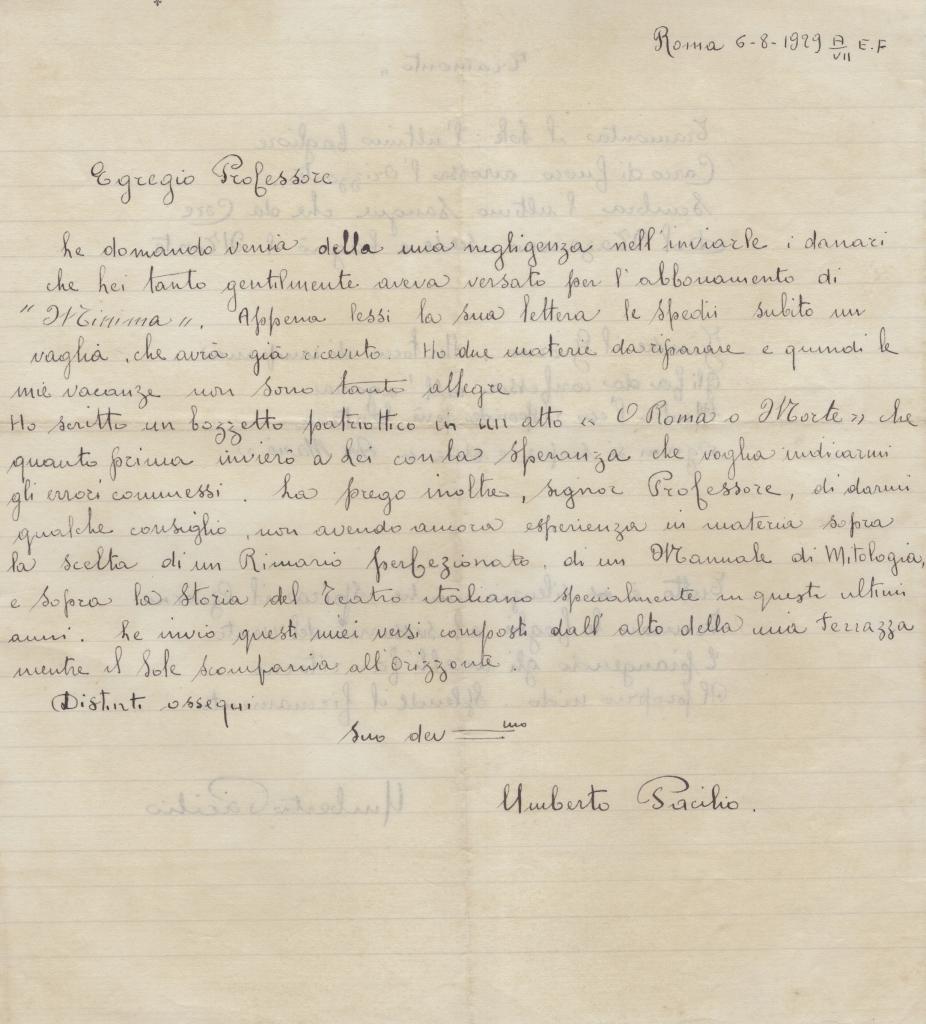 Documento interamente autografo e firmato di Umberto Pacilio, composto da un foglio scritto fronte e retro, contenente una lettera e una poesia dal titolo “Tramonto”, entrambe manoscritte e firmate, datate Roma, 6 agosto 1929 e indirizzate ad un Professore non specificato.