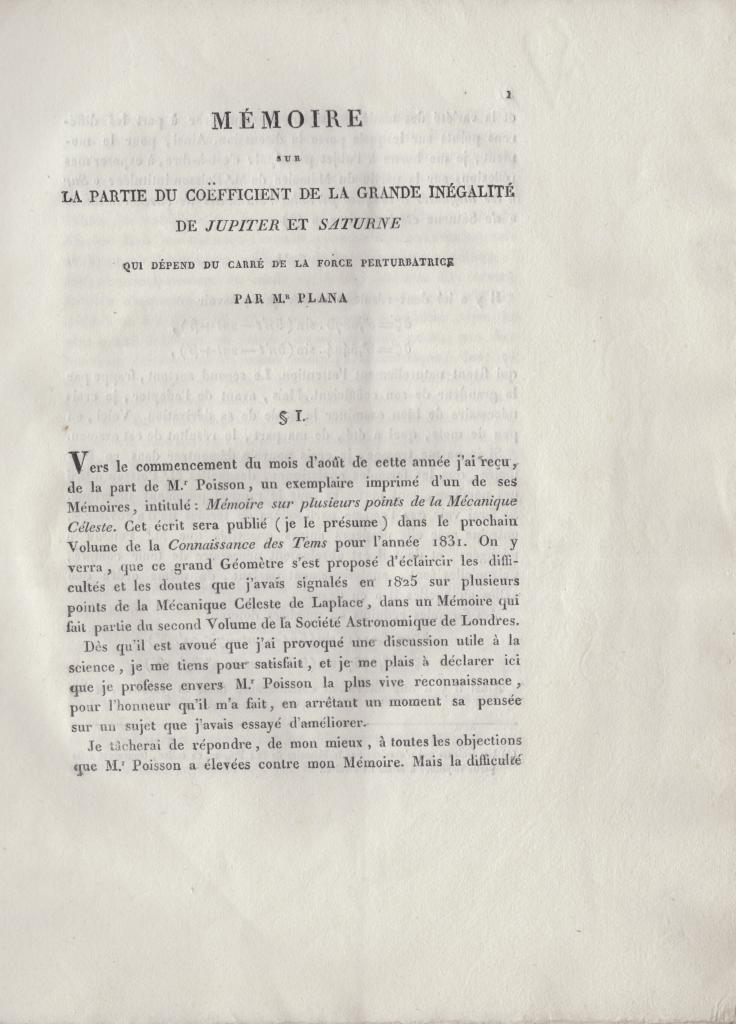 Mémoire sur la partie du coefficient de la grande inégalité de Jupiter et Saturne qui dépend du carré de la force perturbatrice di G. A. Plana, stampata a Torino, presso l’Imprimerie Royale, nel 1828. L’opera, in lingua francese, consta di [2], 43, [1] pagine.