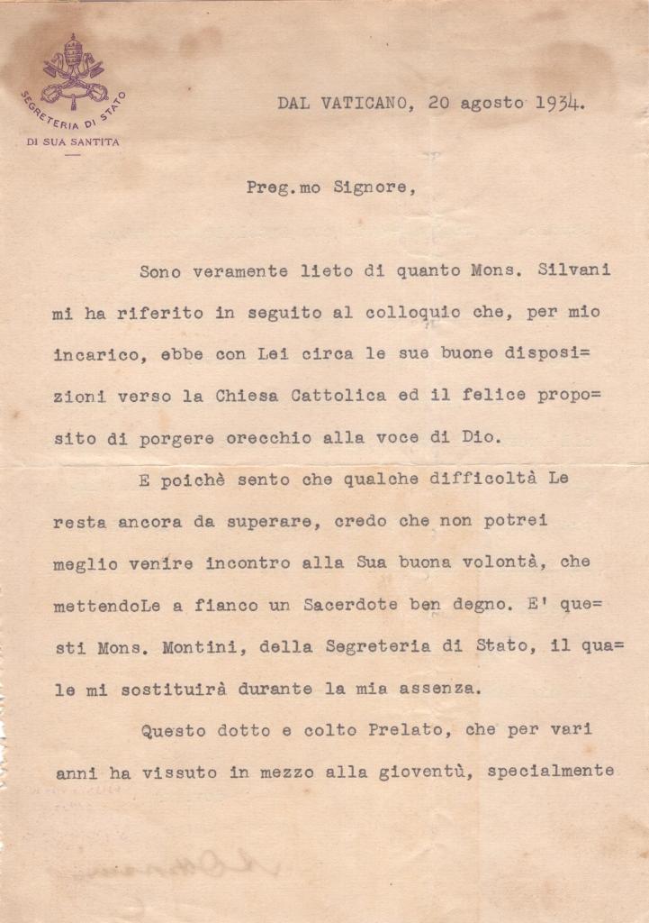Lettera dattiloscritta su carta intestata della Segreteria di Stato di Sua Santità, datata Dal Vaticano, 20 agosto 1934, e firmata dal Cardinale Alfredo Ottaviani. Il testo è indirizzato a un interlocutore laico e affronta temi di carattere spirituale e pastorale, esprimendo apprezzamento per le sue disposizioni verso la Chiesa cattolica e incoraggiandolo a superare alcune difficoltà attraverso un accompagnamento sacerdotale adeguato.