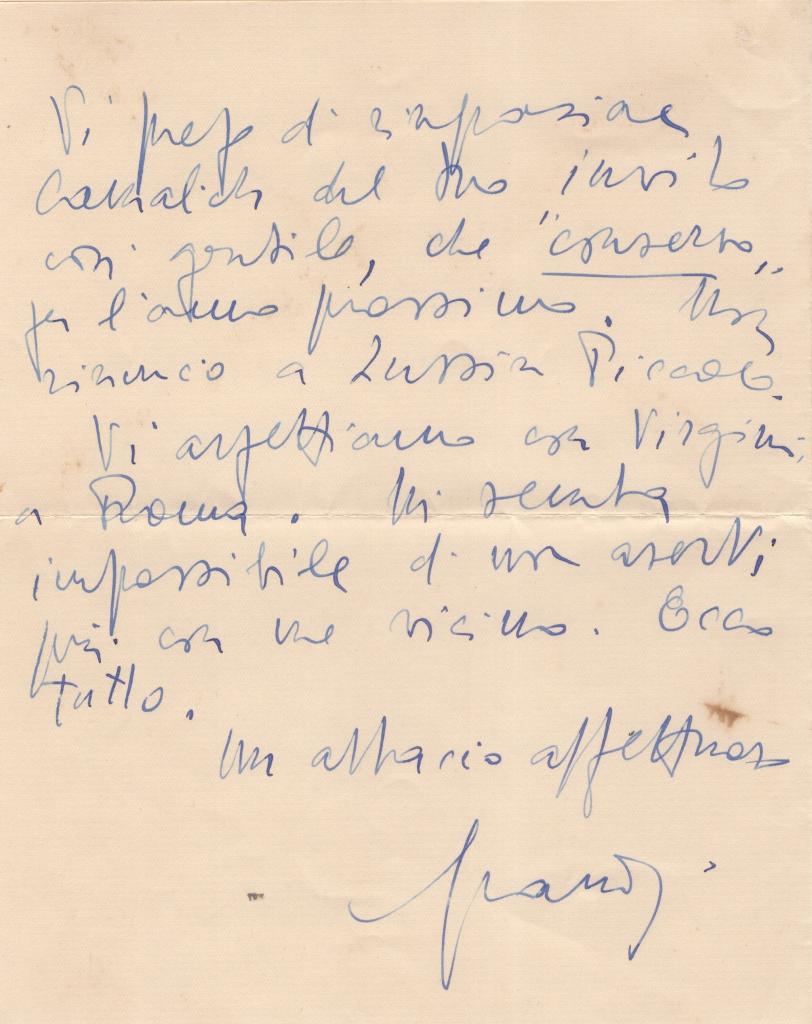 Nella missiva Grandi comunica al destinatario di essere letteralmente sommerso da importanti articoli di codici, proposte legislative e pratiche legate ai procuratori del Re, offrendo uno spaccato diretto dell’intensa attività istituzionale e amministrativa svolta in quel periodo. Il tono, pur informale, riflette il peso delle responsabilità ministeriali in un momento particolarmente delicato della vita politica italiana.