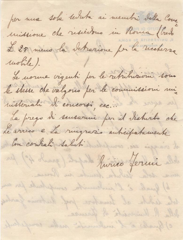 Lettera autografa di Enrico Fermi su carta dell’Istituto di Fisica di Roma relativa a compensi e incarichi accademici.