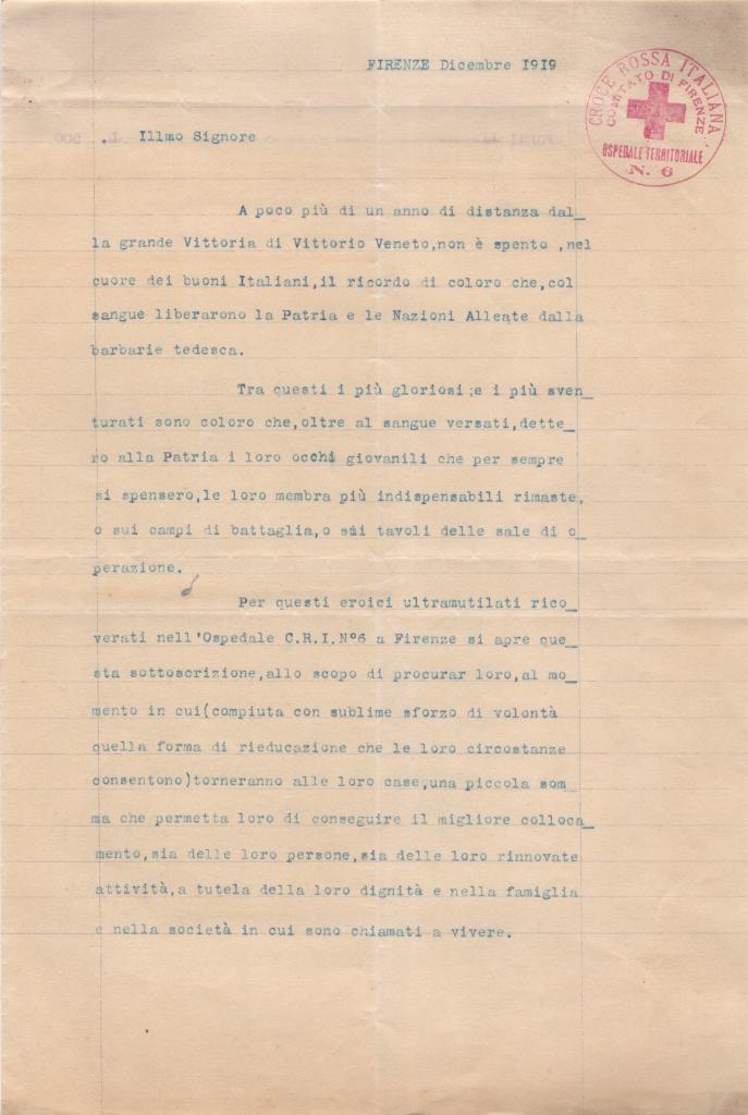 Il complesso documentario si colloca nel delicato periodo immediatamente successivo alla Prima guerra mondiale ed è legato all’attività assistenziale della C.R.I. a favore dei militari ultramutilati, ricoverati presso l’Ospedale Territoriale n. 6 di Firenze.