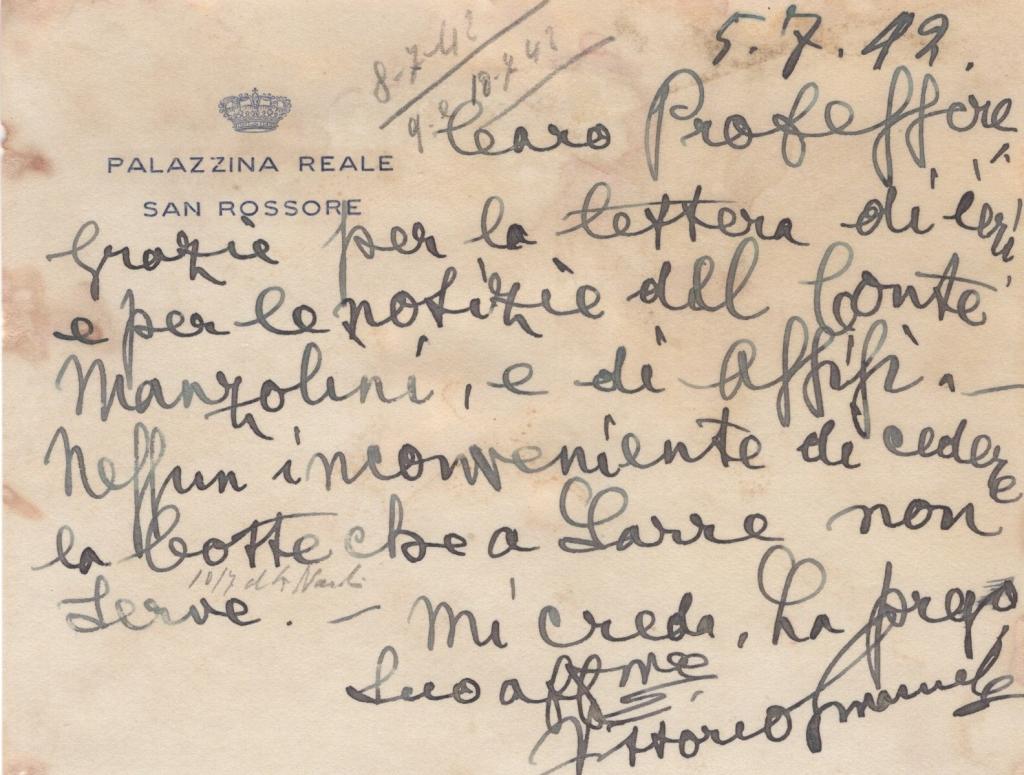 La seconda, datata 5 luglio 1942, è anch’essa indirizzata allo stesso professore e fa riferimento a notizie riguardanti il conte Manzolini e ad altre comunicazioni ricevute. Il re ringrazia per le informazioni e conclude con formula di cordialità e firma autografa “Vittorio Emanuele”.