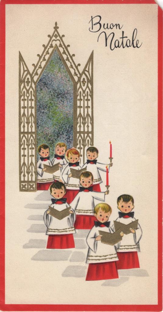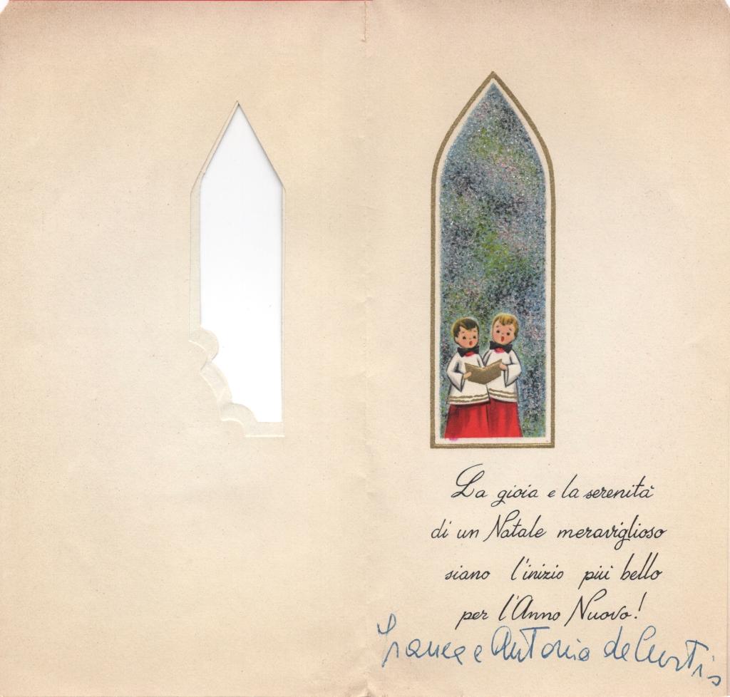 Biglietto augurale natalizio interamente autografo di Franca De Curtis con illustrazione a colori raffigurante due piccoli cantori entro una finestra gotica. Il testo a stampa reca l’augurio: «La gioia e la serenità di un Natale meraviglioso siano l’inizio più bello per l’Anno Nuovo!».