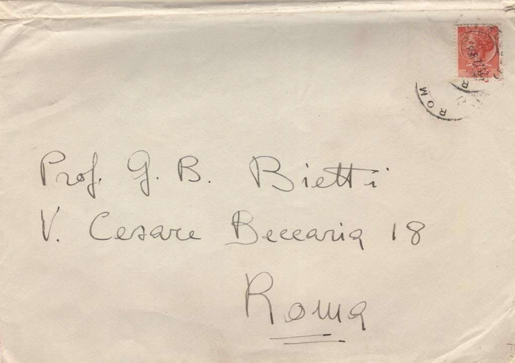 In calce compare la firma autografa «Franca e Antonio De Curtis», indirizzata al «Caro Professore», con espressioni di augurio sincere e affettuose. È presente la busta viaggiata, indirizzata al Prof. G. B. Bietti in Roma, con francobollo e timbri postali.