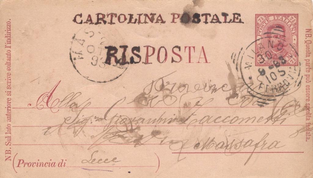 Autografo di Ulrico Hoepli su cartolina postale del Regno d’Italia, viaggiata e affrancata, recante al verso comunicazione manoscritta su carta intestata “Ulrico Hoepli – Milano – Libraio della Real Casa”.
