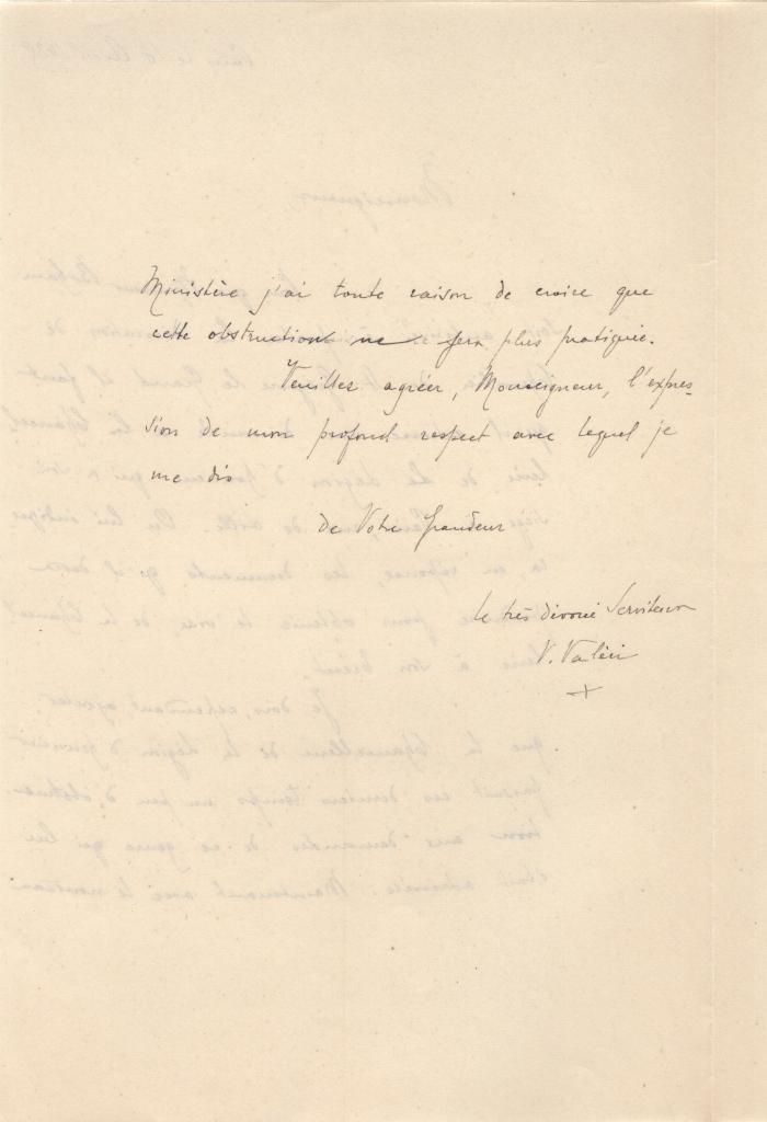 Nella parte conclusiva Valeri aggiunge che la Cancelleria della Légion d’Honneur, negli ultimi tempi, ha mostrato una certa severità verso richieste di questo genere, ma ritiene che tale atteggiamento non persisterà. La lettera si chiude con formula di profondo rispetto: