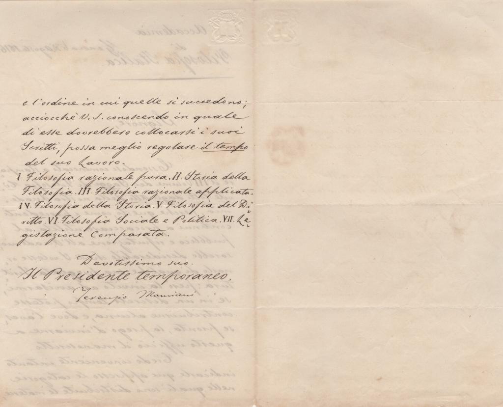 La lettera elenca inoltre le categorie tematiche in cui sono suddivise le materie dei Saggi: Filosofia razionale pura, Storia della filosofia, Filosofia razionale applicata, Filosofia della storia, Filosofia del diritto, Filosofia sociale e politica, Legislazione comparata.