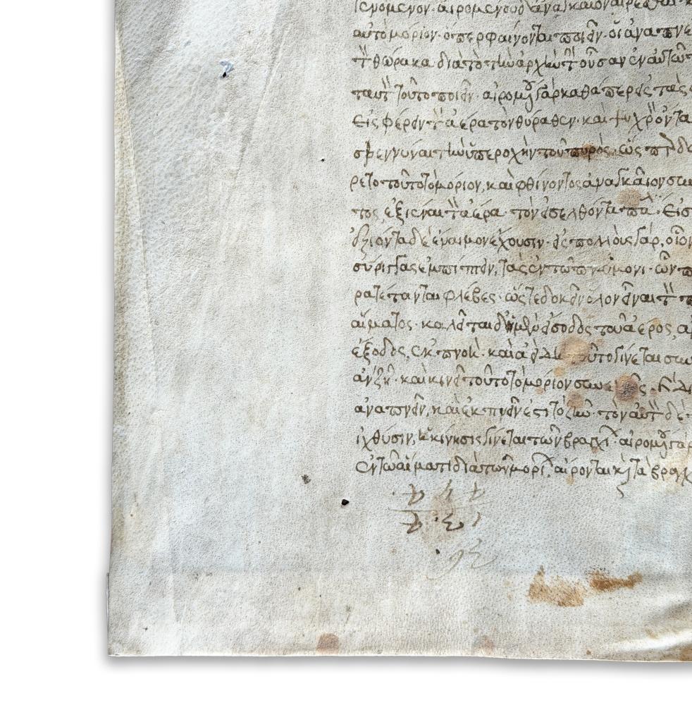 Questo manoscritto medievale greco su pergamena del XIII secolo, ora in asta, rappresenta una testimonianza di eccezionale importanza per la storia della medicina antica e medievale, documentando la persistenza e l’elaborazione della dottrina cardiocentrica di matrice aristotelico-galenica in ambito bizantino. Oggetto di altissimo interesse per collezionisti di manoscritti medievali, studiosi di codicologia, filologi e specialisti di storia della medicina.