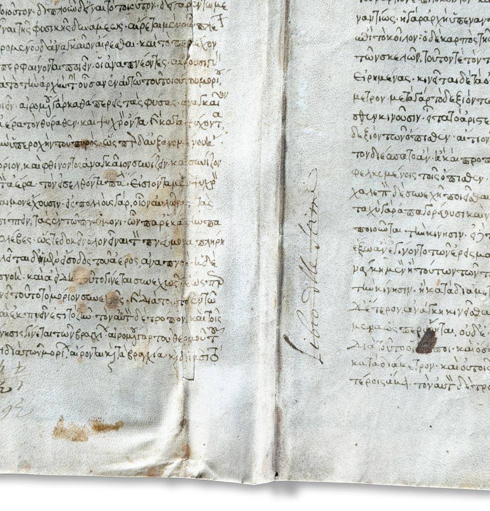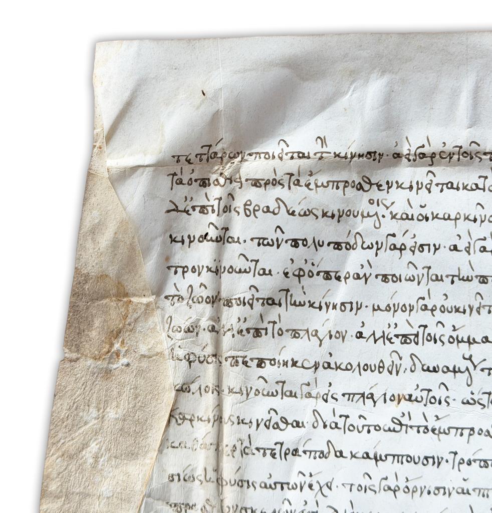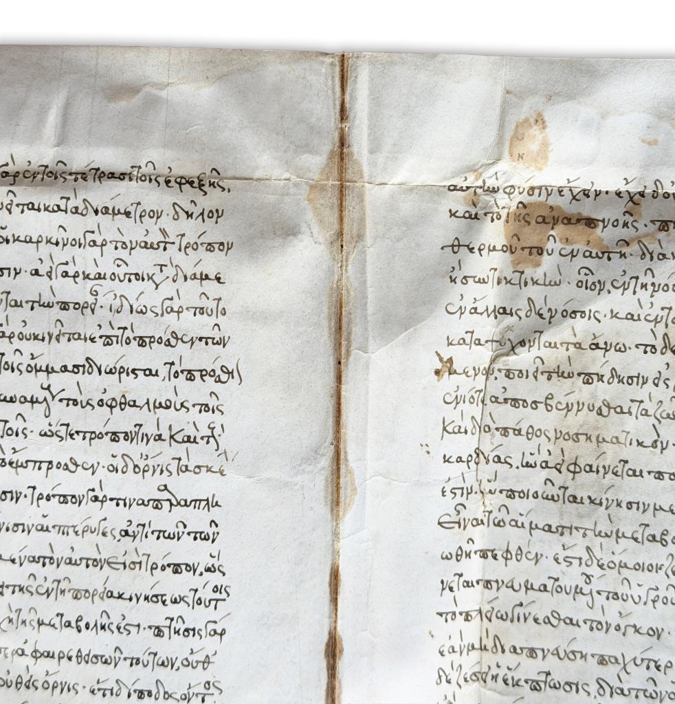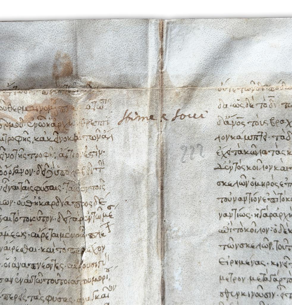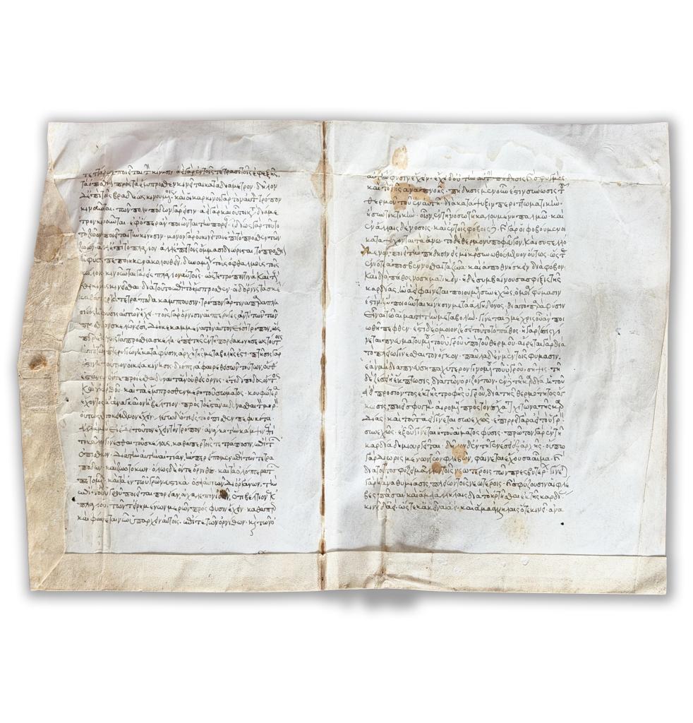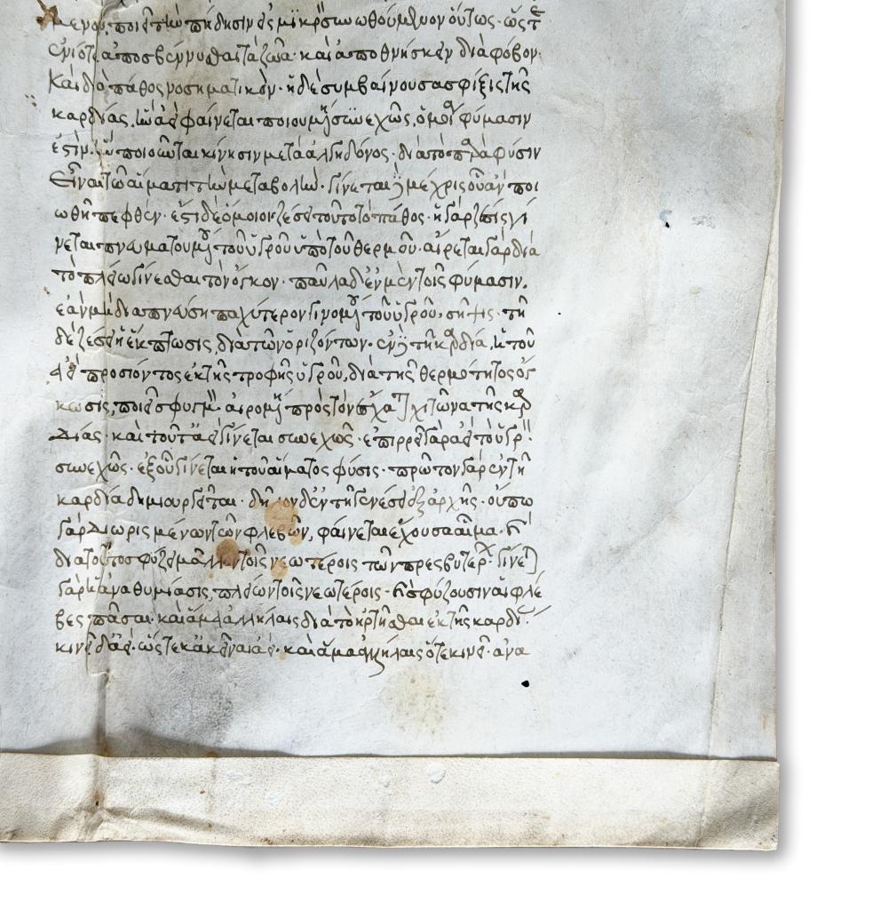 Rarissimo manoscritto medievale in pergamena del XIII secolo, redatto in lingua greca, contenente un significativo trattato di medicina antica incentrato sulla concezione cardiocentrica dell’organismo. Il codice, di straordinario interesse per la storia della medicina medievale e per gli studi di ambito bizantino, espone una dottrina fisiologica in cui il cuore è definito principio vitale e radice di ogni funzione corporea.