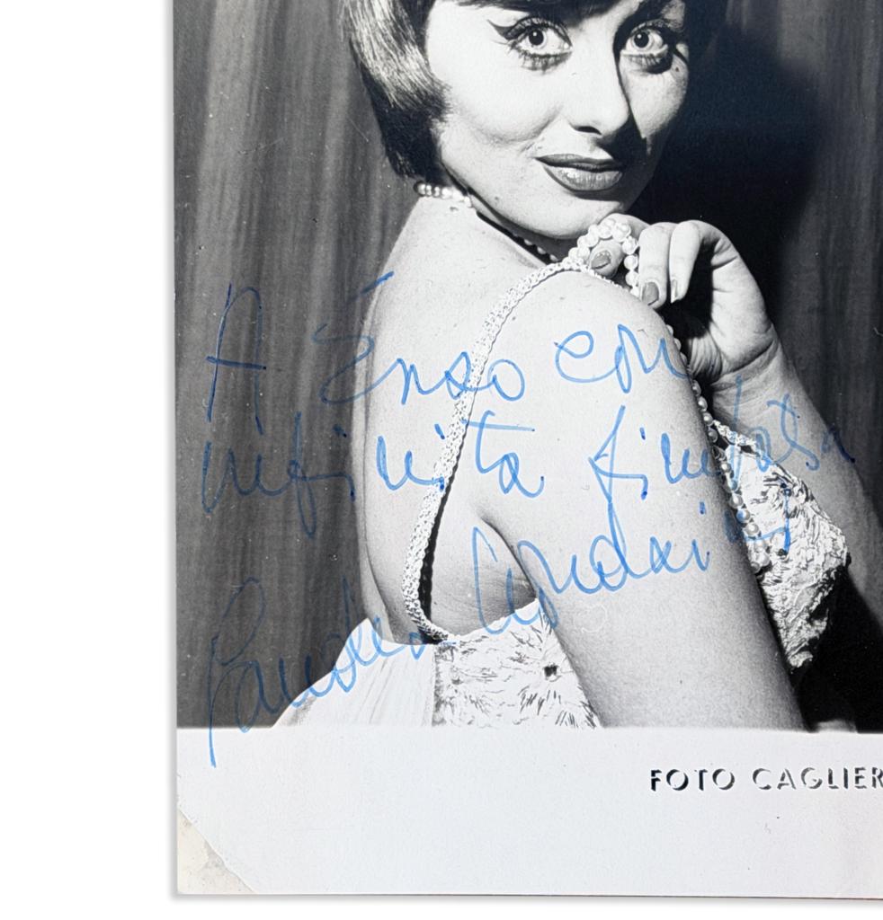 Fotografia con autografo di Sandra Mondaini bianco e nero, realizzata dallo studio “Foto Cagliero”, raffigurante l’attrice in posa elegante e sorridente, con tipica espressione vivace e ironica che ne caratterizzò l’immagine pubblica. La dedica manoscritta, apposta a inchiostro blu direttamente sulla superficie fotografica, è indirizzata a Enzo Nubola e seguita dalla firma autografa dell’artista.