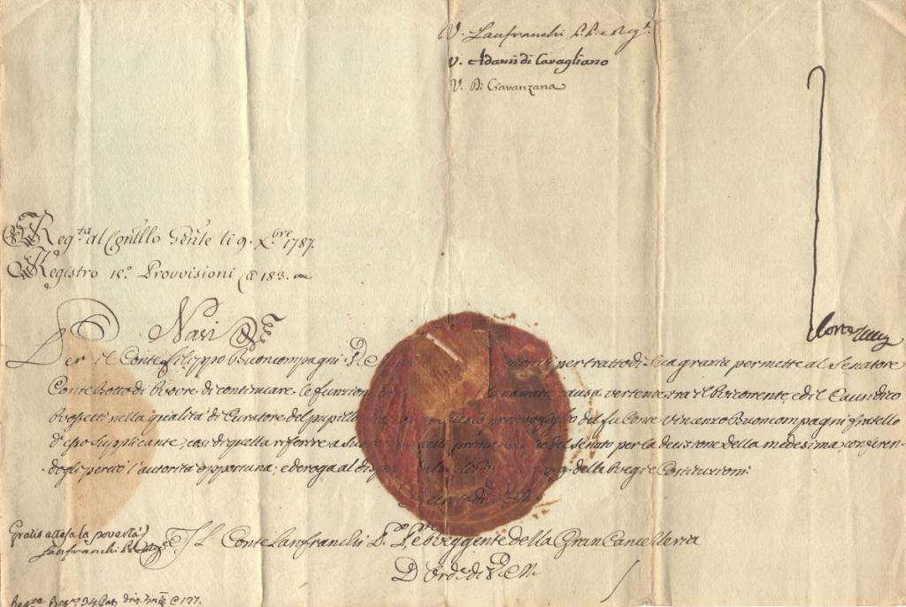 Nella missiva il sovrano dispone in merito a una controversia legale tra la famiglia Boncompagni e il causidico Bossetti, autorizzando il Conte Botto a continuare a esercitare le funzioni di relatore nella causa. Il testo si inserisce nel linguaggio giuridico-amministrativo dell’epoca e riflette l’intervento diretto dell’autorità sovrana nelle dinamiche giudiziarie e nella gestione delle competenze.