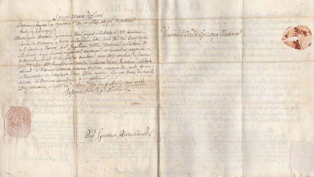 Pergamena manoscritta con autografi del Cardinale Niccolò Maria Antonelli e del vescovo di Modena Giuseppe Maria Fogliani, redatta a Roma il 1° marzo 1765, con intestazione pontificia “CLEMENS PP. XIII”, indirizzata alla nobile famiglia Munarini di Modena.