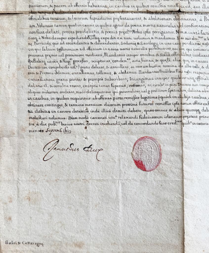 Il testo, in latino, è disposto in caratteri tipografici fitti e regolari, secondo la prassi amministrativa del primo Seicento, e formalizza una concessione di privilegi ducali, con disposizioni di natura giuridico-amministrativa volte a regolare diritti, esenzioni o benefici a favore di soggetti o comunità. Nella parte inferiore è presente la sottoscrizione autografa del duca (“Ranuccius Dux”), accompagnata da sigillo impresso in ceralacca rossa, elemento di autenticazione e validazione dell’atto. In calce compaiono ulteriori sottoscrizioni di funzionari e cancellieri ducali.