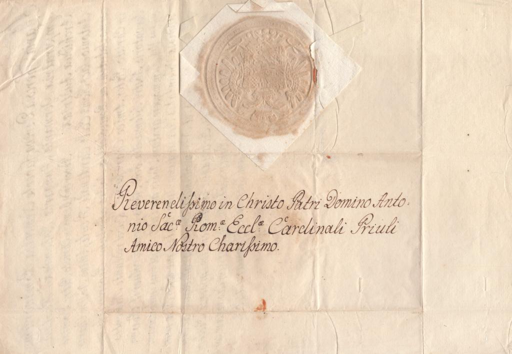Al verso è presente l’indirizzo manoscritto al cardinale Priuli, accompagnato da sigillo cartaceo impresso con aquila imperiale.