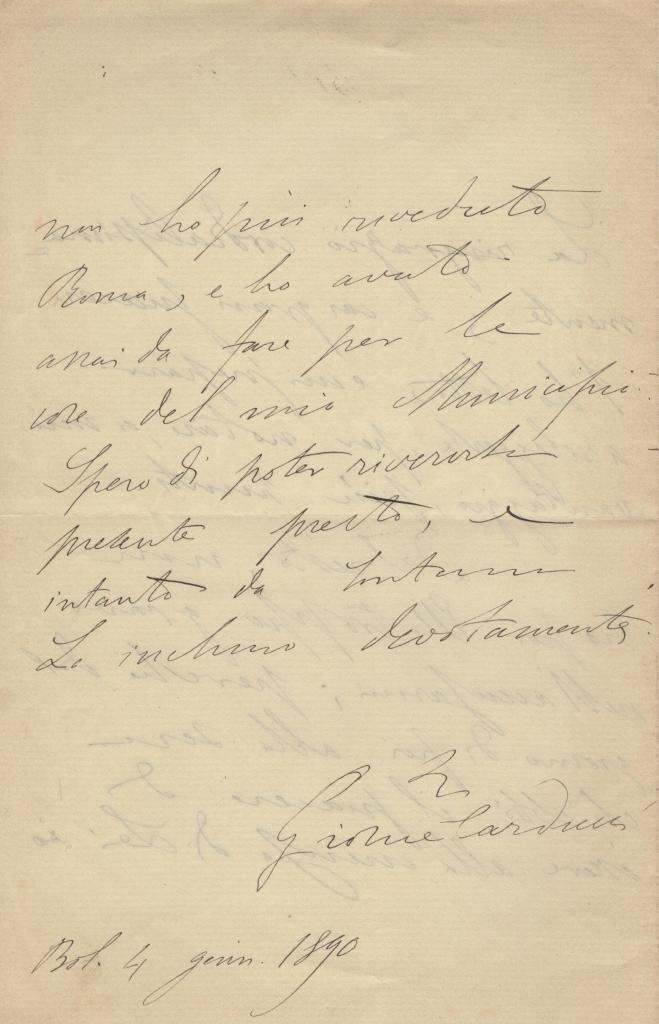 Lettera interamente autografa di Giosuè Carducci, datata Bologna 4 gennaio 1890, indirizzata ad una “Gentiliss. signora Contessa”.