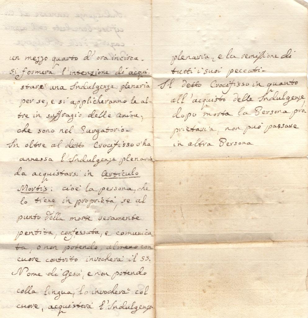 Nei testi si esplicita chiaramente la funzione del crocifisso quale oggetto devozionale associato alla concessione di indulgenze plenarie, con indicazioni pratiche relative alle condizioni richieste (confessione, comunione o, in mancanza, invocazione contrita del Nome di Gesù), nonché alla possibilità di applicazione in suffragio delle anime del Purgatorio. È inoltre presente un esplicito riferimento all’esercizio della Via Crucis, pratica alla quale risultano annesse le indulgenze descritte.