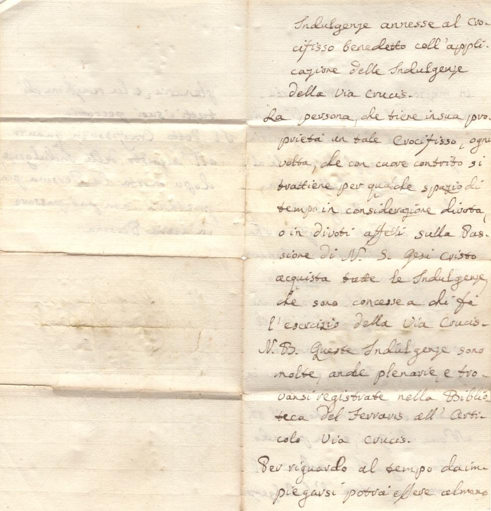 Tra XVII e XIX secolo la pratica delle indulgenze costituiva un elemento centrale della devozione cattolica, regolamentata dopo il Concilio di Trento e diffusa attraverso oggetti quali crocifissi, rosari e medaglie ai quali venivano associate specifiche concessioni spirituali. La Via Crucis rappresentava uno dei principali strumenti di meditazione sulla Passione di Cristo e di ottenimento di indulgenze. In ambito monastico femminile, tali pratiche assumevano un carattere quotidiano e personale, spesso trasmesso anche attraverso corrispondenza privata tra religiose e familiari, come nel presente caso documentato.